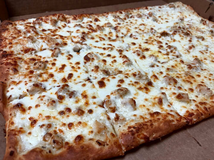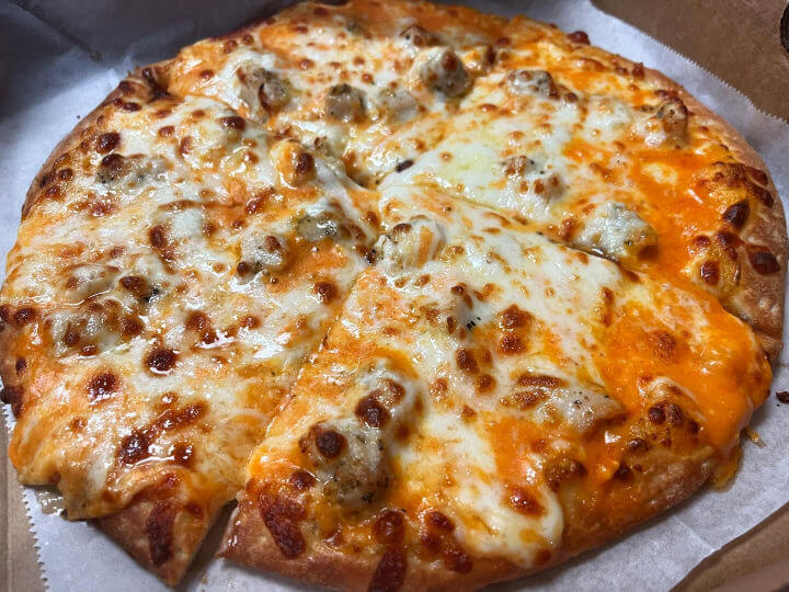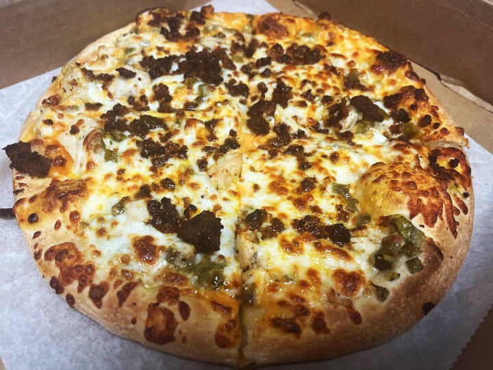 Spicy Buffalo Sauce, No Pizza Sauce, Chorizo, Grilled Chicken, Jalapeno Peppers, Mozzarella Cheese, Fresh Garlic, Hot Sauce