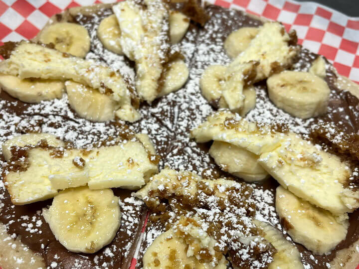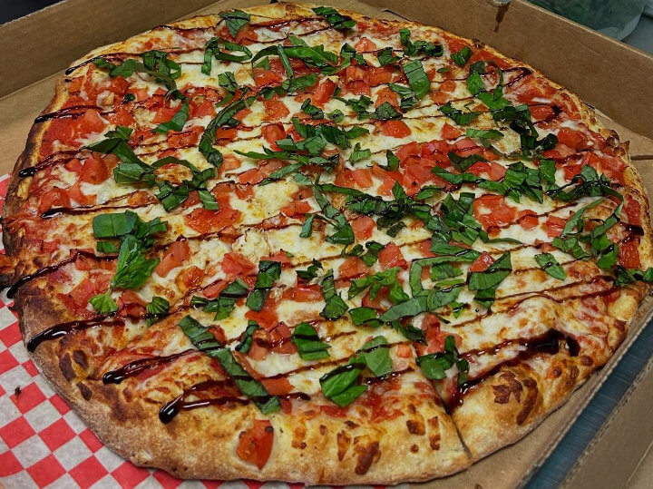 Homemade Marinara, Balsamic Glaze, Tomatoes, Mozzarella Cheese, Fresh Basil, Fresh Garlic