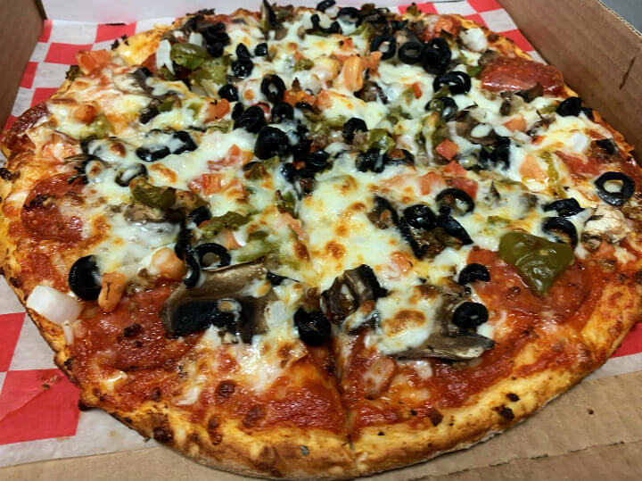 Homemade Marinara, Black Olives, Green Olives, Green Peppers, Mushrooms, Onions, Tomatoes, Mozzarella Cheese, Fresh Garlic