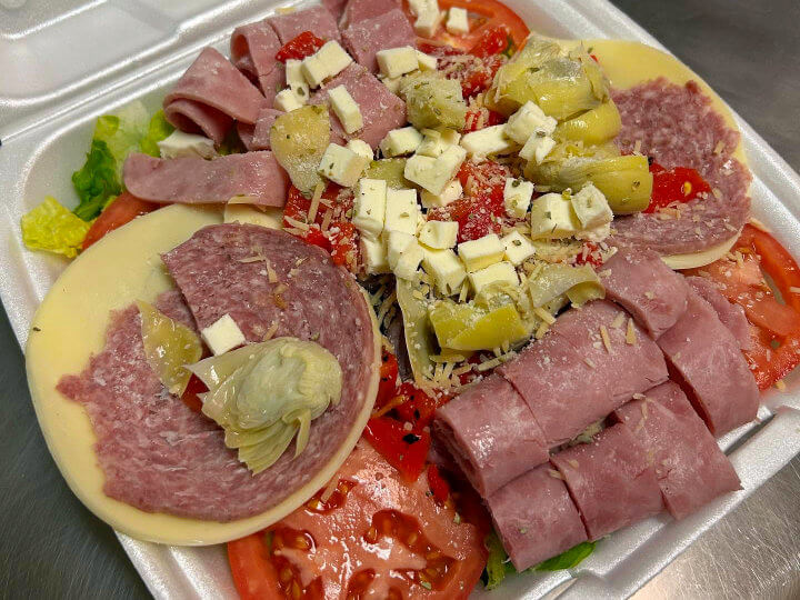 Romaine Lettuce, Artichoke Hearts, Black Olives, Red Onions, Red Roasted Peppers, Tomatoes, Ham, Salami, Mozzarella Cheese, Provolone Cheese