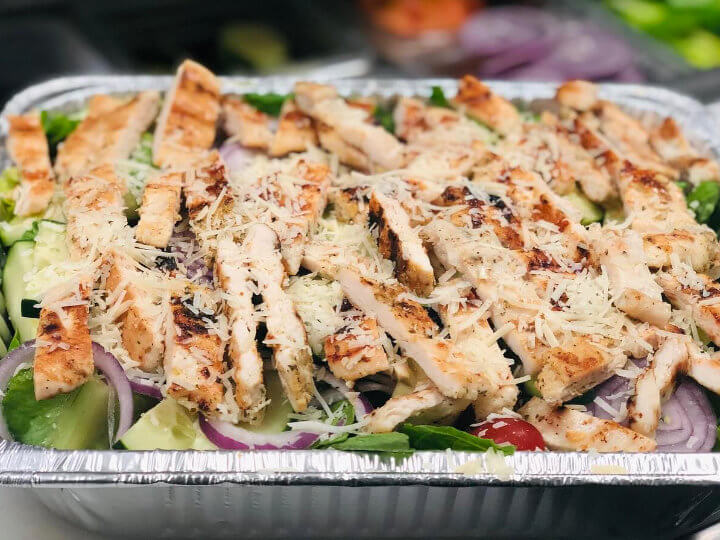 Romaine Lettuce, Cucumbers, Green Olives, Red Onions, Tomatoes, Grilled Chicken, Bacon, Mozzarella Cheese